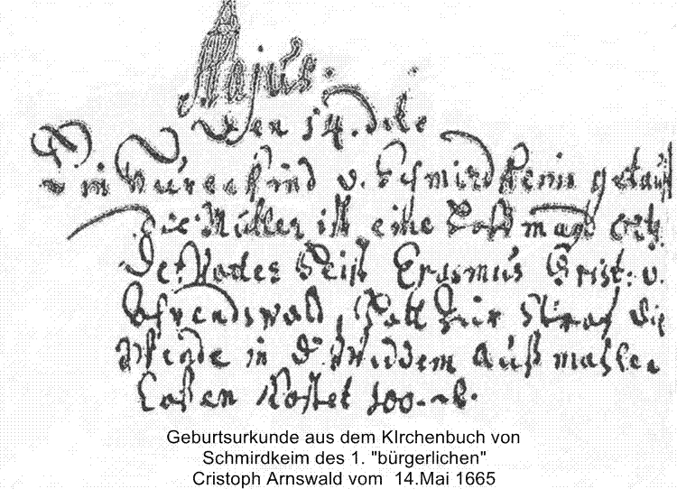 Mit der ersten Urkunde vom 22. Oktober 1217 beginnt die Zeitrechnung des Namens (von) Arnswald. In dieser Urkunde treten Burchard von Honstein und sein Bruder Hermann von Arnswald als Zeugen auf. Diese Urkunde ist als Original im Staatsarchiv Wolfenbüttel zu finden. Am 14. Mai 1665, also vor 350 Jahren, wurde der 1. „Bürgerliche“ Arnswald auf Schmirdkeim/Ostpreußen geboren. Sein Vater war der Soldat Leutnant der Freikompanie zu Fuß von Lesgewang Erasmus Christoph von Ahrendswald, geboren um 1633, gestorben im November 1886 auf Schmirdkeim. Die Mutter des nichtehelichen Christoph war die Hofmagd Orte oder Ortusch. Im Jahre 1665 heiratete Erasmus Christoph von Ahrendswald dann noch die Anna Euphrosine von Strauss, die 1699 verstarb. Mit ihr hatte er dann noch 6 eheliche Kinder.